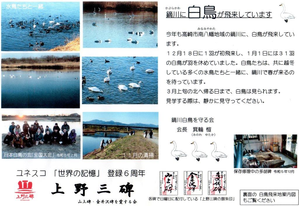 2024年01月11日 白鳥飛来地紹介パネルの設置 「山上碑・金井沢碑を愛する会」では、本年度も山上碑及び金井沢碑の来館者向けに、2碑の「あずま屋」に白鳥飛来地の案内パネルが設置してあります。 「会員様への通知」カテゴリの最新記事 < 前の記事次の記事 > コメント このブログにコメントするにはログインが必要です。 さんログアウト この記事には許可ユーザしかコメントができません。 コメントフォーム 名前 コメント 記事の評価 リセット リセット 顔 星 情報を記憶 コメントを投稿する